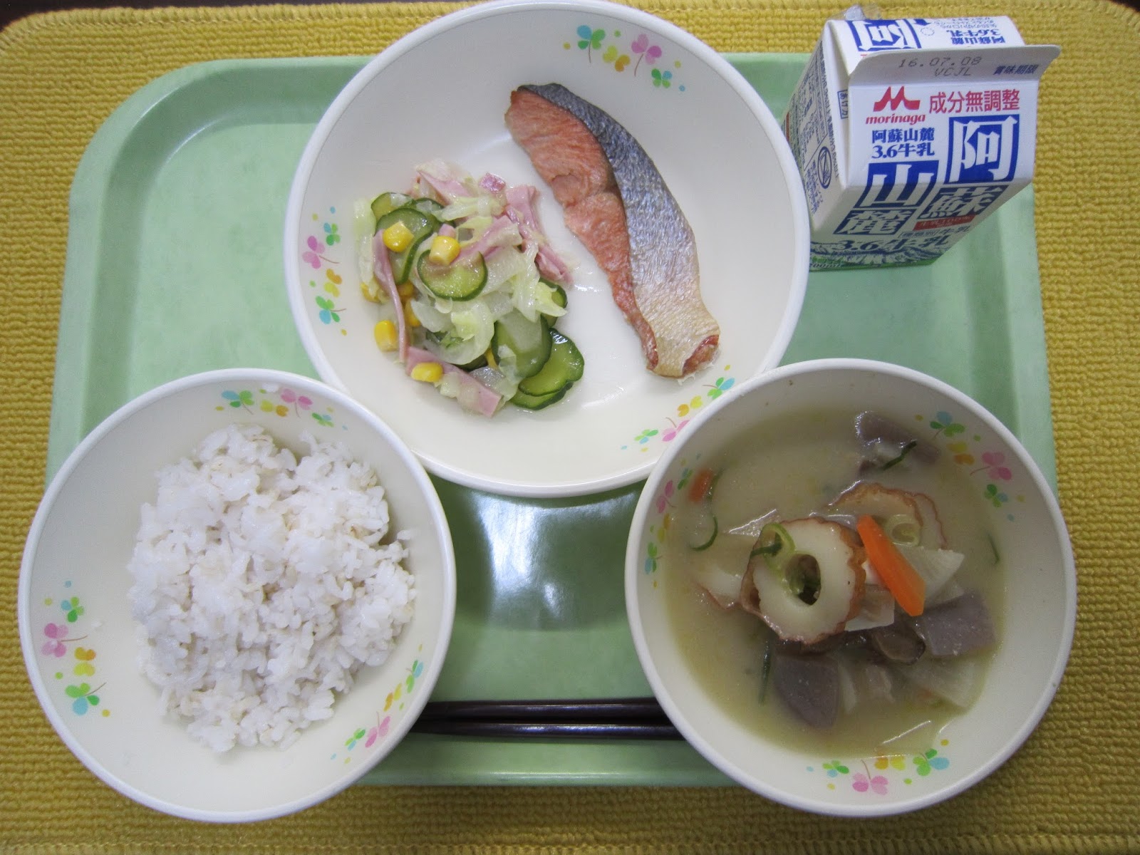 キムタクごはん 牛乳 すまし汁 千草焼き おかかあえ 今日は、夏休み前最後の給食でした。キムチとたくあんを使ったキムタクごはんを作りました。キムチが入ることで少しピリッとしていて、子どもたちの食欲をそそるメニューだったようです。キムタクごはんの残りはほとんどありませんでした。暑...